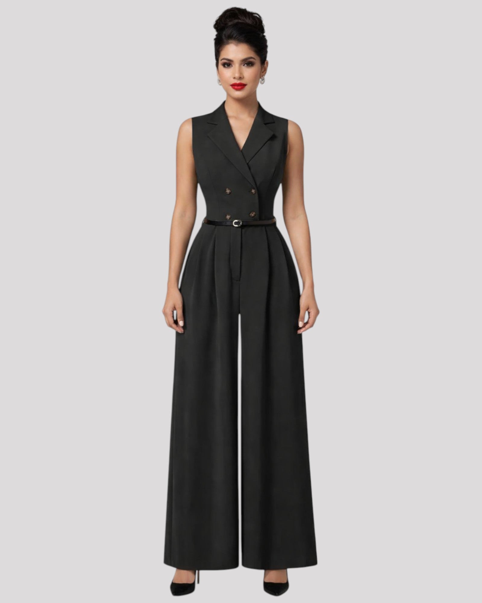 Step into elevated style with our Sleeveless Double-Breasted Jumpsuit, where tailored sophistication meets effortless charm. This structured piece features a blazer-style bodice with a smart lapel collar, double-breasted buttons, and a cinched waist enhanced by a sleek black belt. The wide-leg trousers create a graceful flow, adding movement and balance to the strong silhouette.