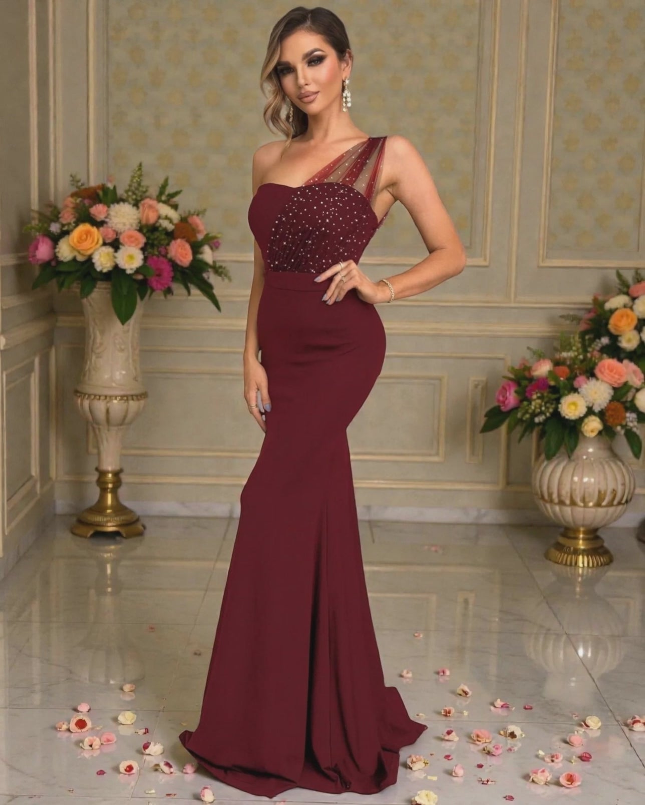 This Strapless Dress with diamonte detail and one shoulder feature is available in 3 colours. The diamonte feature adds a touch of glamour to this elegant dress, while the mermaid skirt creates a flattering silhouette.