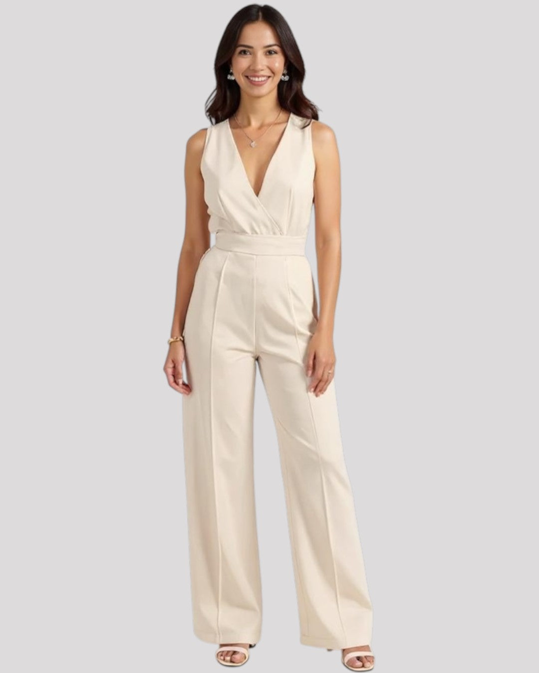 Step into effortless sophistication with our Elegant Sleeveless V-Neck Jumpsuit. Tailored to flatter, this chic cream one-piece features a deep V-neckline, a cinched waist for a defined silhouette, and wide-leg trousers that flow gracefully with every step. Whether you're heading to a brunch, a business event, or a stylish evening out, this jumpsuit brings timeless elegance with a modern edge.